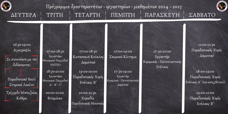 « Previous Πρόγραμμα δραστηριοτήτων - εργαστηρίων - μαθημάτων 2024-2025 Δραστηριότητες - Εργαστήρια - Μαθήματα | 2024-2025 Next »