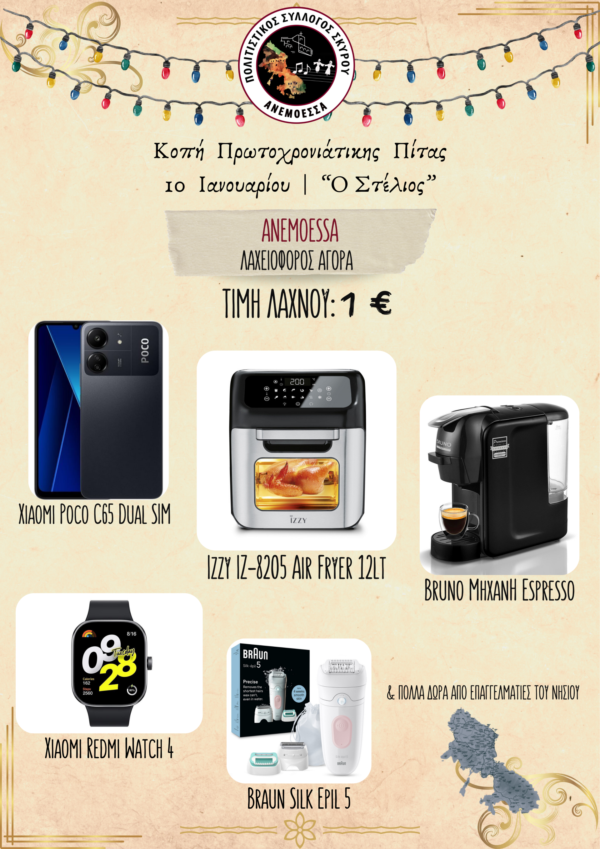 Ο Πολιτιστικός Σύλλογος Σκύρου σας καλεί στην Κοπή της Πρωτοχρονιάτικης Πίτας, την Παρασκευή 10 Ιανουαρίου, στις 20:30, στο εστιατόριο "Ο Στέλιος".