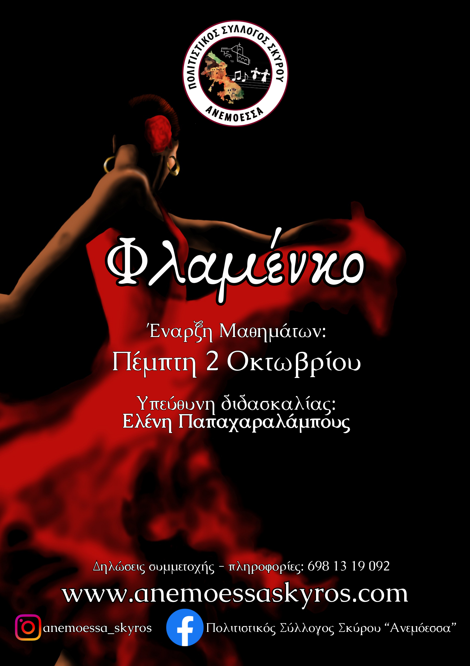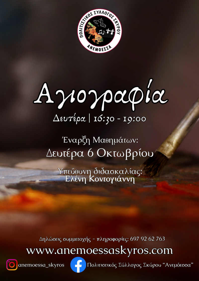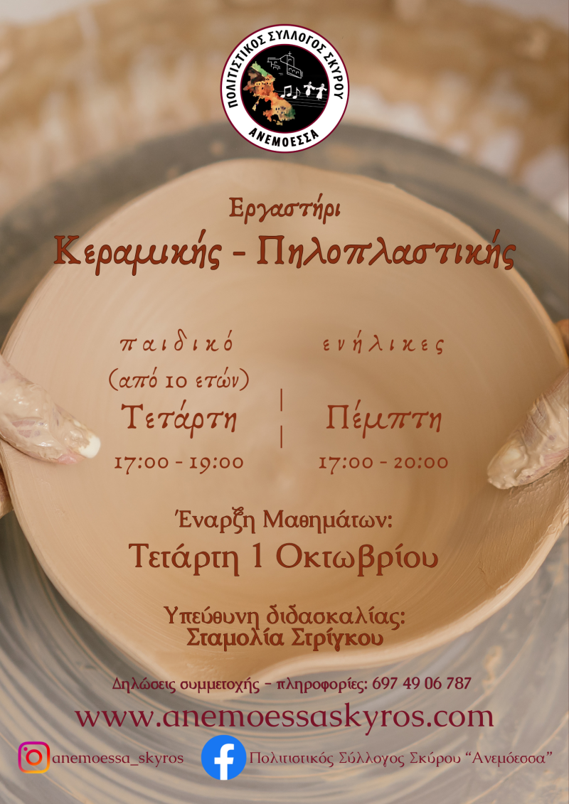 Φλαμένκο | Πέμπτη 2 ΟκτωβρίουΑγιογραφία | Δευτέρα 6 ΟκτωβρίουΣκυριανό Κέντημα | Δευτέρα 6 ΟκτωβρίουΚεραμική - Πηλοπλαστική | Τετάρτη 15 Οκτωβρίου