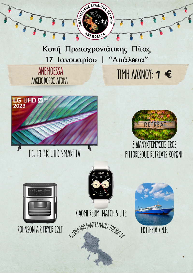 Θα πραγματοποιηθεί λαχειοφόρος αγορά με μεγάλα δώρα, καθώς και δώρα από επαγγελματίες του νησιού.