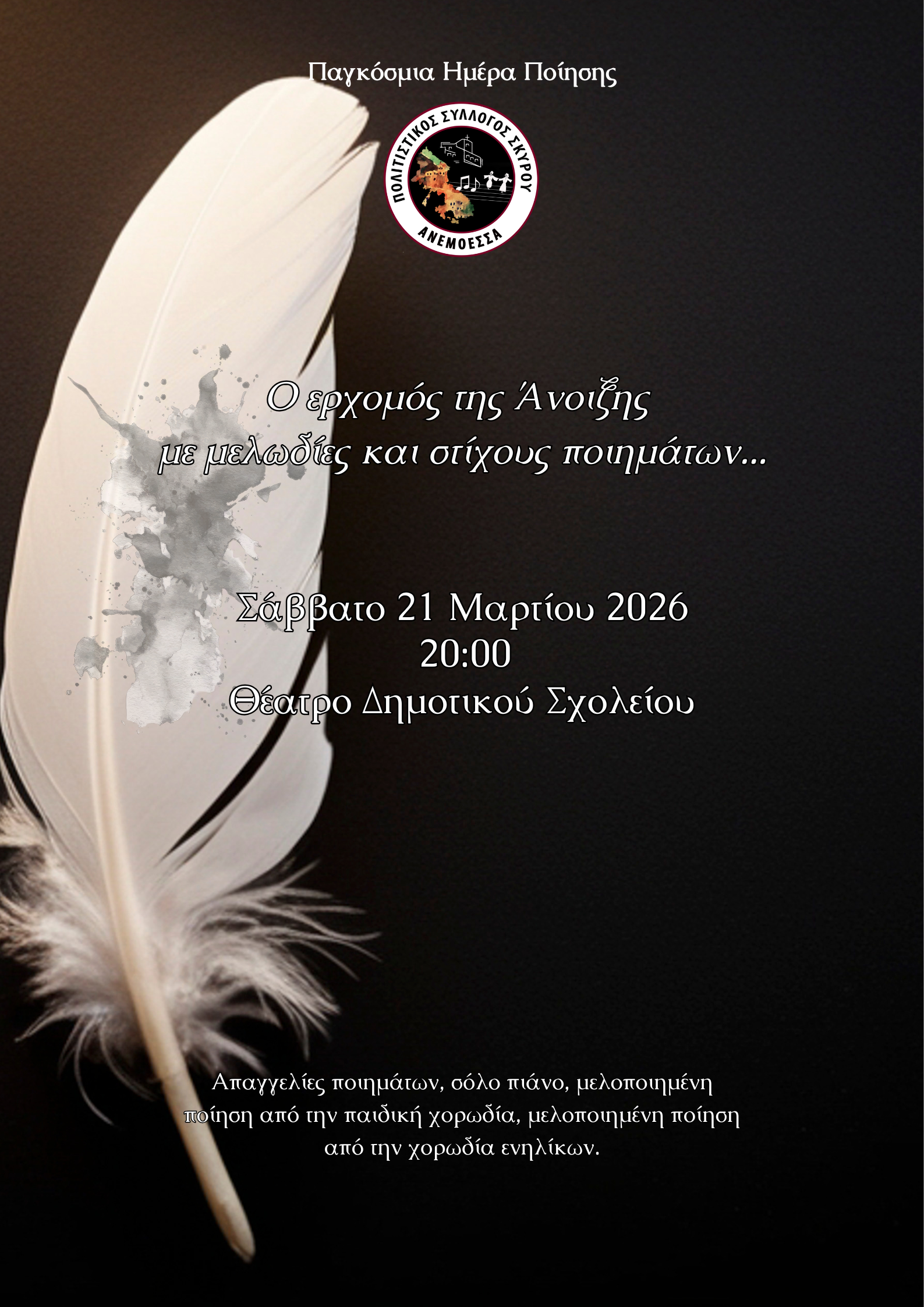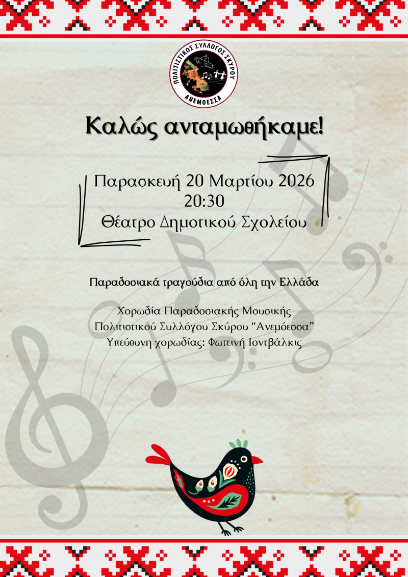 Ο Πολιτιστικός Σύλλογος Σκύρου "Ανεμόεσσα" διοργανώνει διήμερες εκδηλώσεις με το τμήμα Χορωδίας παραδοσιακής μουσικής, α) την Παρασκευή 20 Μαρτίου στις 20:30 με παραδοσιακά τραγούδια από όλη την Ελλάδα, και β) το Σάββατο 21 Μαρτίου στις 20:00, αφιερωμένη στην Παγκόσμια Ημέρα Ποίησης, με απαγγελίες ποιημάτων, σόλο πιάνο, μελοποιημένη ποίηση από την παιδική χορωδία, μελοποιημένη ποίηση από την χορωδία ενηλίκων.