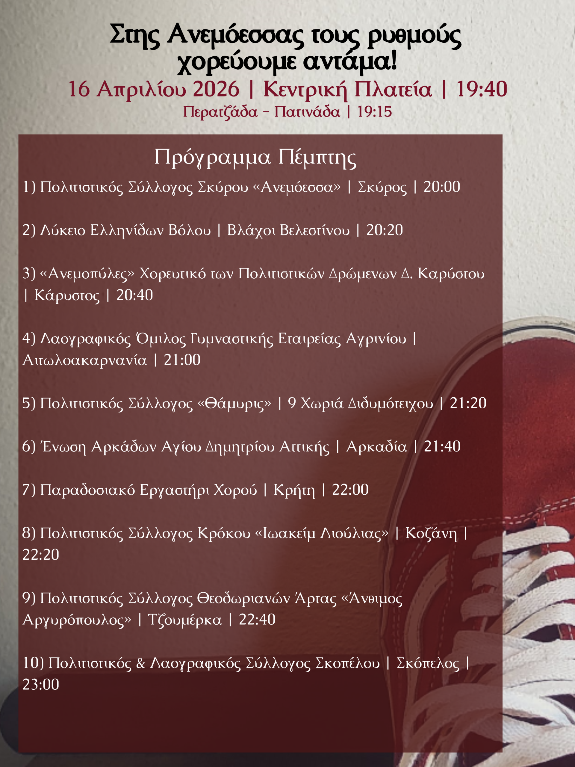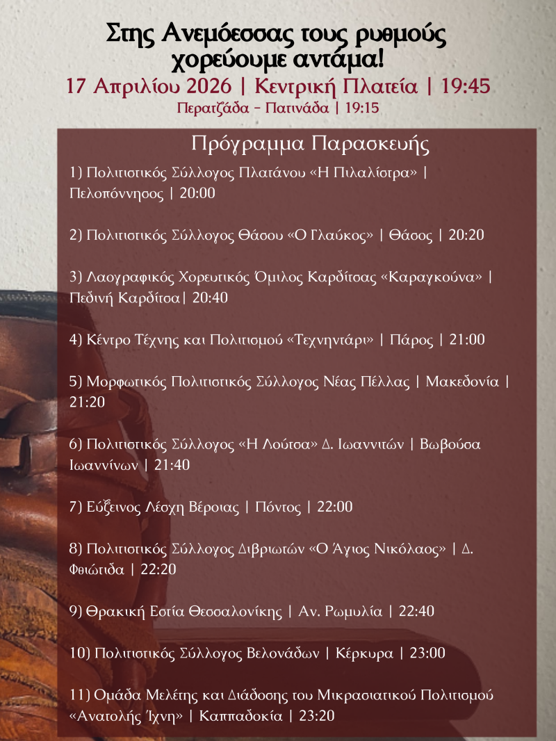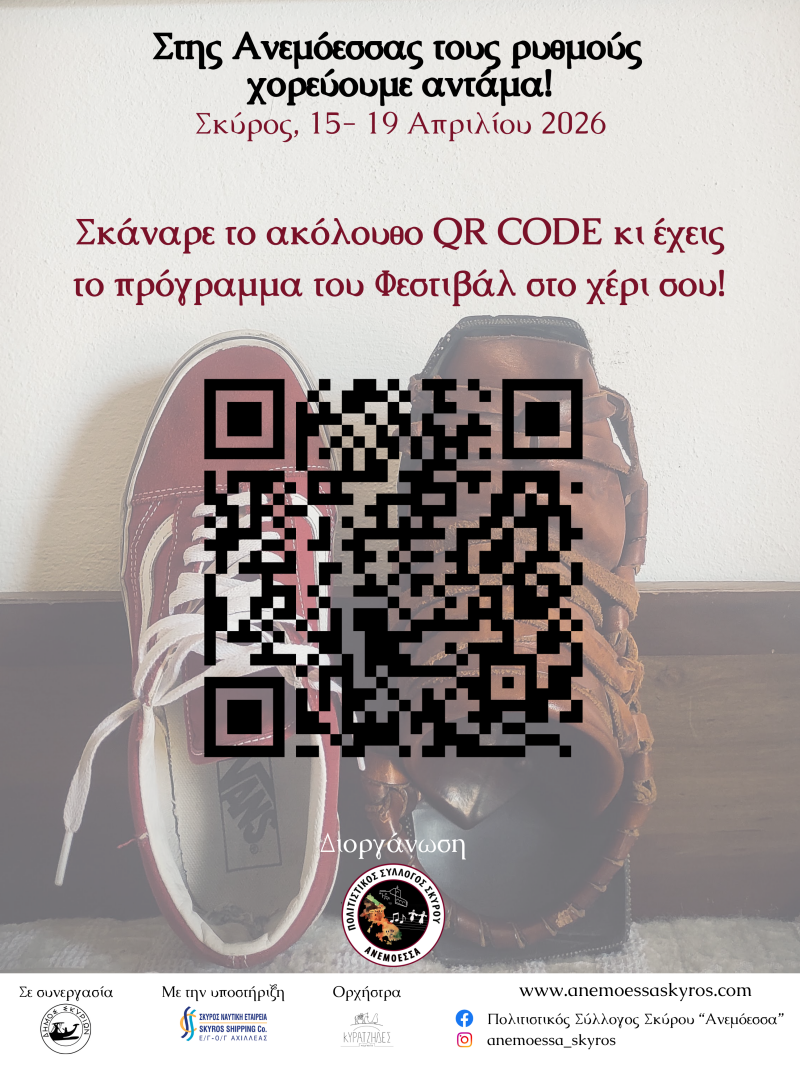 Το πρόγραμμα του ανταμώματός μας: "Στης Ανεμόεσσας τους ρυθμούς χορεύουμε αντάμα! 2026" στις ακόλουθες εικόνες και στο ακόλουθο QR Code.