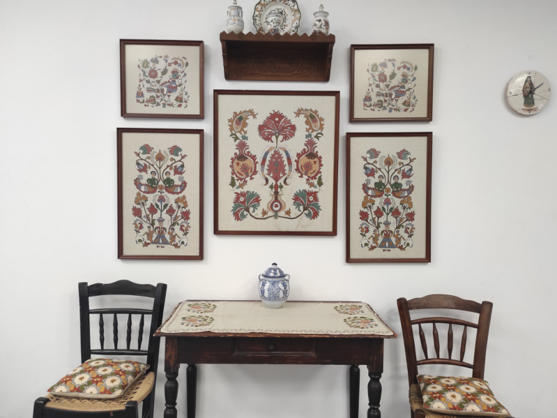 Οι τοίχοι του σπιτιού και ο χώρος πάνω από τη φ'γού (τζάκι), είναι στολισμένοι με όλα τα χρηστικά και διακοσμητικά αντικείμενα, κεραμικά, γυαλικά και μεταλλικά. Η προέλευση, η σπανιότητα και η ποσότητα των αντικειμένων αυτών χαρακτήριζαν την οικονομική ευρωστία των ιδιοκτητών τους και αποτελούσαν δείγμα κοινωνικής καταξίωσης.